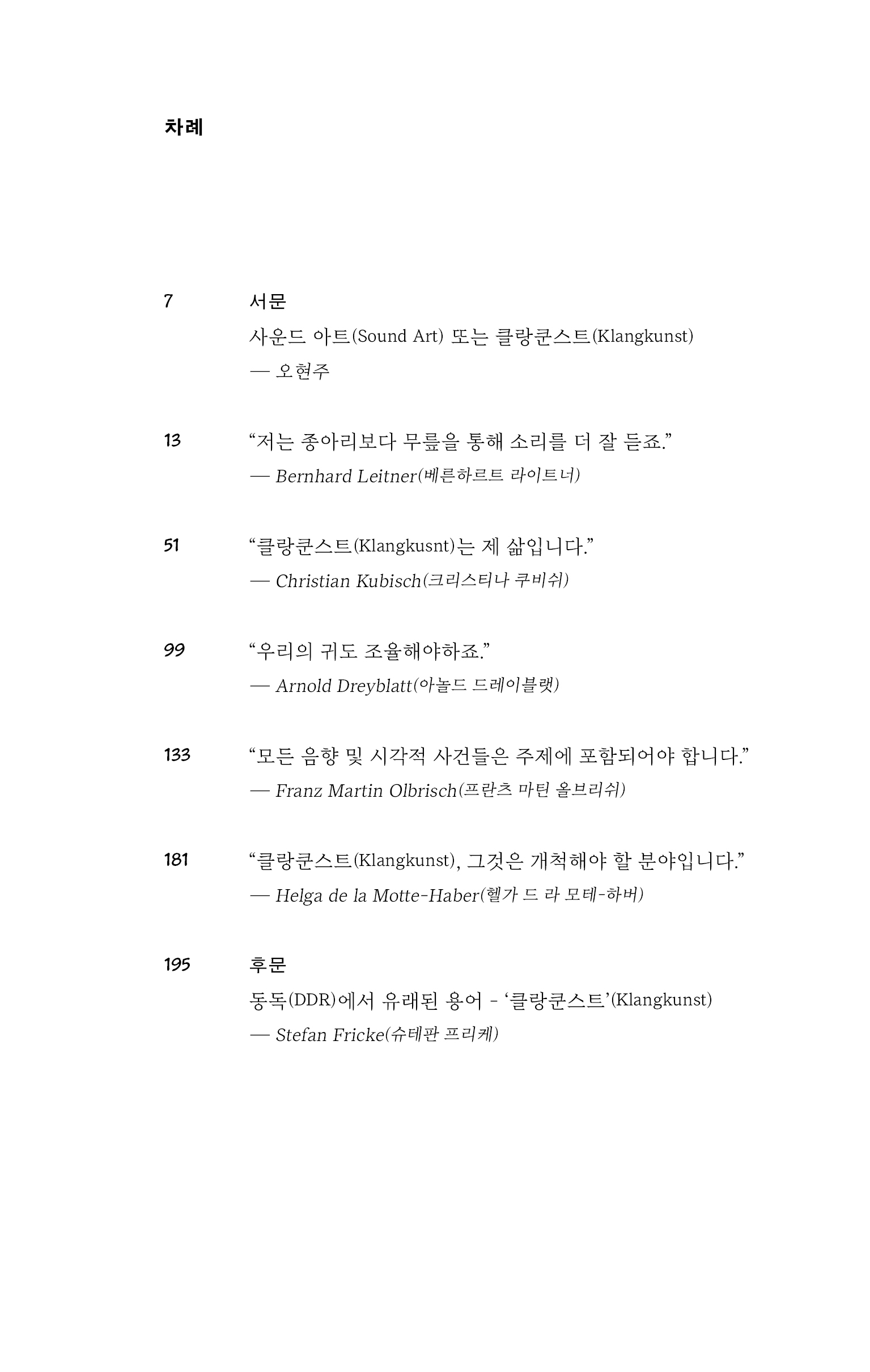모든 감각으로: 클랑쿤스트 Klangkunst 소리 · 공간 · 미디어 · 신체 Artbookpress, Seoul 2024 ISBN 979-11-977853-7-5 |