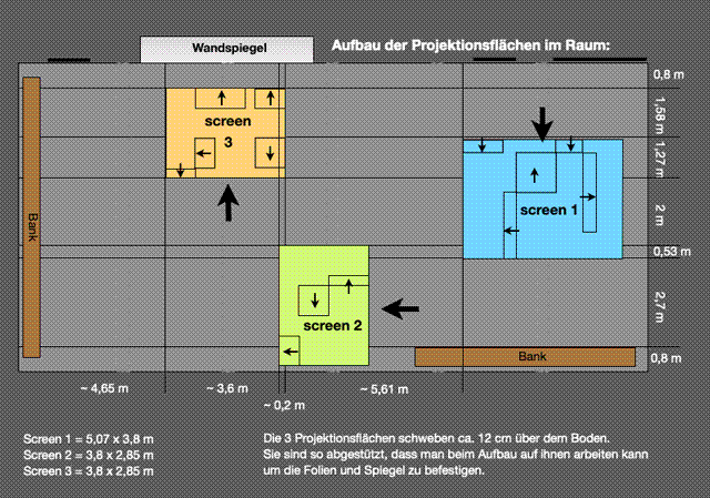 | ...Visuell ist das Environment durch die drei auf dem Fußboden verteilten Projektionsflächen gegliedert. Die vertikalen Projektionen der Videos lassen eine ungewöhnliche Nähe zu den Bildern entstehen. Darüber hinaus werfen die in die Projektionsflächen eingearbeiteten Spiegel nicht nur Teile der Projektion in den Raum, sondern lassen umgekehrt auch Teile des Raumes und des Publikums in den Projektionen erscheinen. Für die Bildinhalte der Videoprojektionen wurde – wie in der Musik – das Konzept der Fragmentierung und Überlagerung vorgefundener Materialien angewandt. Die einzelnen Bildebenen verschmelzen ineinander und zeigen dabei verschiedene Grade von Konkretheit und Verfremdung. Sie wechseln zwischen Abbild und abstrakter Form. Ihre Komponenten erzählen keine Geschichte, sie wirken eher wie bewegte Fotografien. | ||