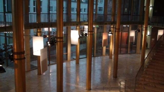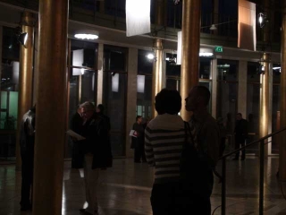 ![]() ...Die Klangereignisse treten vereinzelt, fast zusammenhangslos auf. Verstärkt wird diese Wirkung durch den Einsatz von Elektrostaten als Lautsprecher. Diese Elektrostaten mit ihren extrem kleinen Abstrahlwinkeln werfen die Klänge wie Lichtstrahlen in den Raum, so dass deren Reflexionen auf den gebogenen Wänden der Goldhalle die architektonische Besonderheit klanglich erfahrbar machen. Isoliert stehen die Klänge in diesem überdimensionierten Raum. Nirgends will sich Nähe oder gar Intimität einstellen, alles bleibt offen, bleibt auf Distanz.